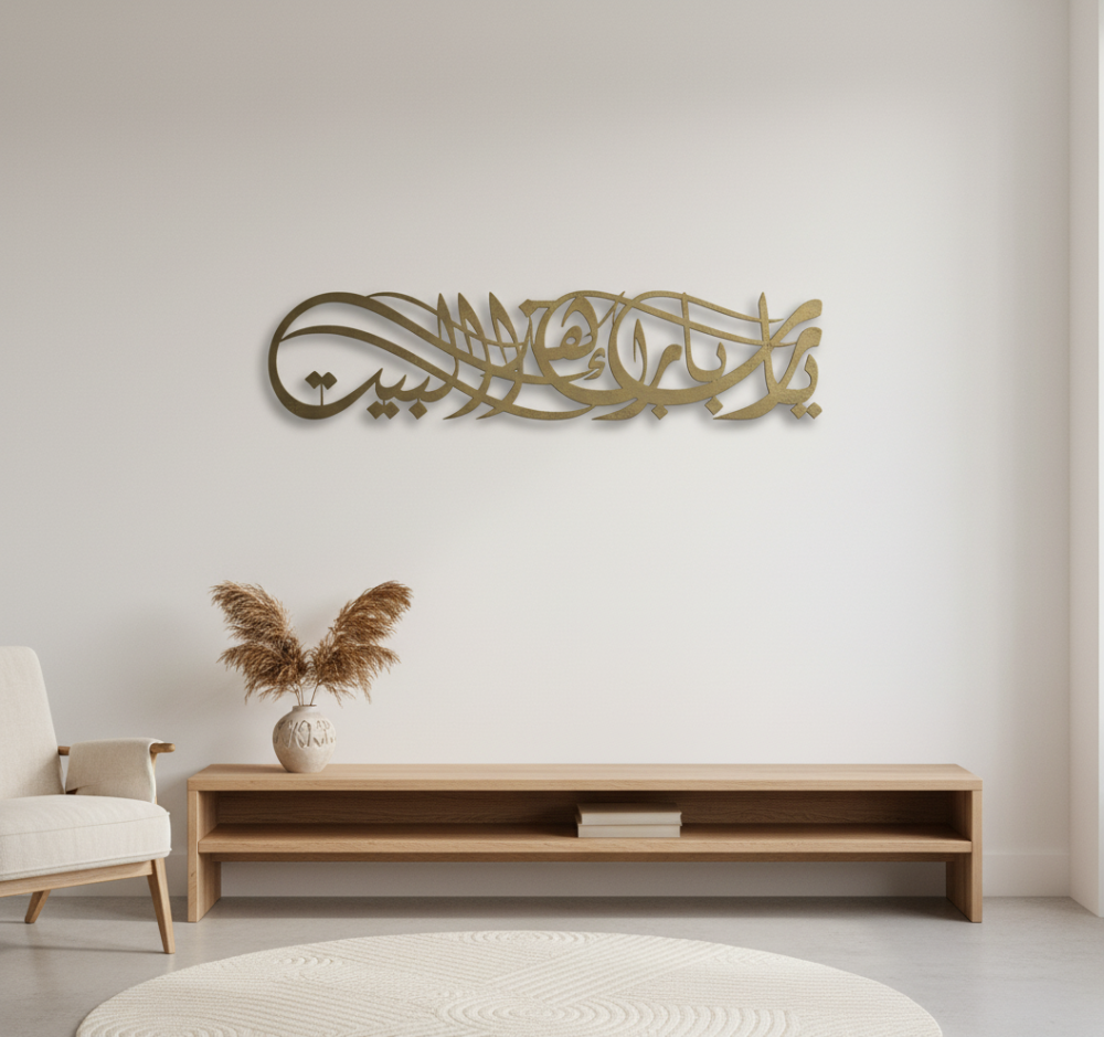 تتميز اللوحة بتصميمها البسيط الذي يجمع بين الأصالة والحداثة، بالإضافة إلى عبارة "ربي بارك هذا البيت" المحفورة بعناية. مصنوعة اللوحة من مواد عالية الجودة، مما يجعلها متينة ومقاومة للعوامل الجوية.